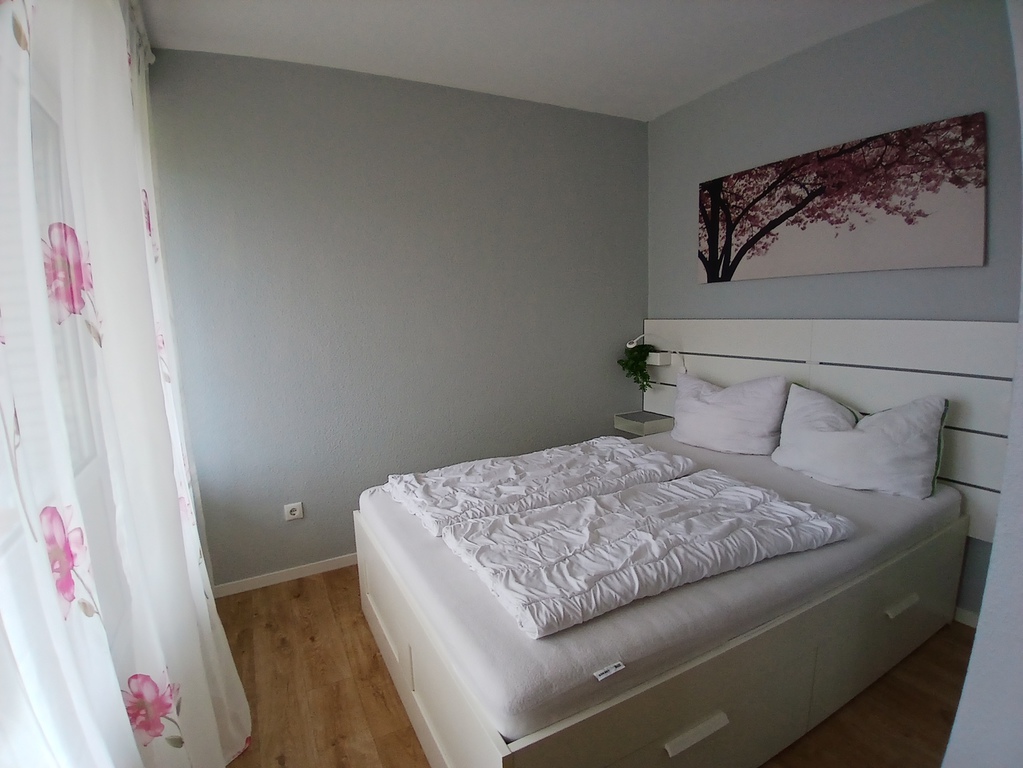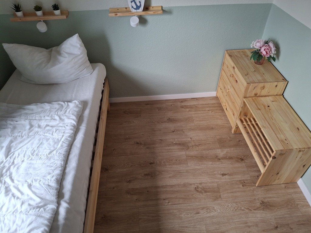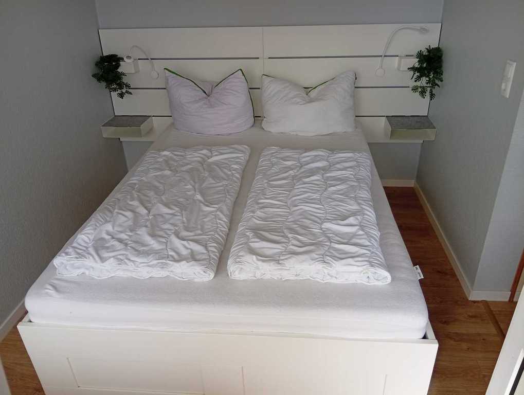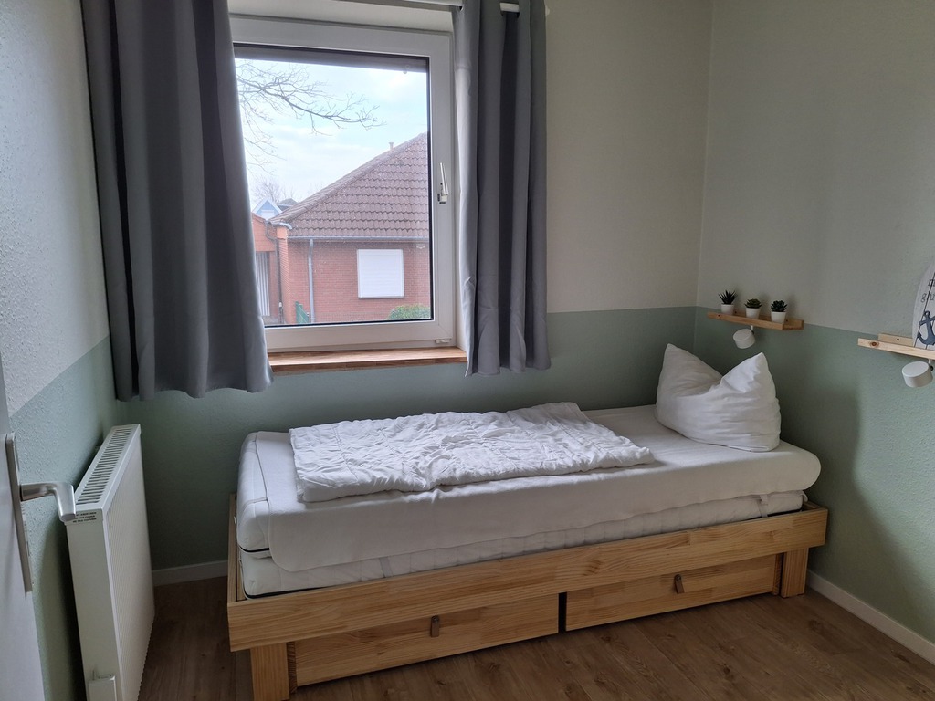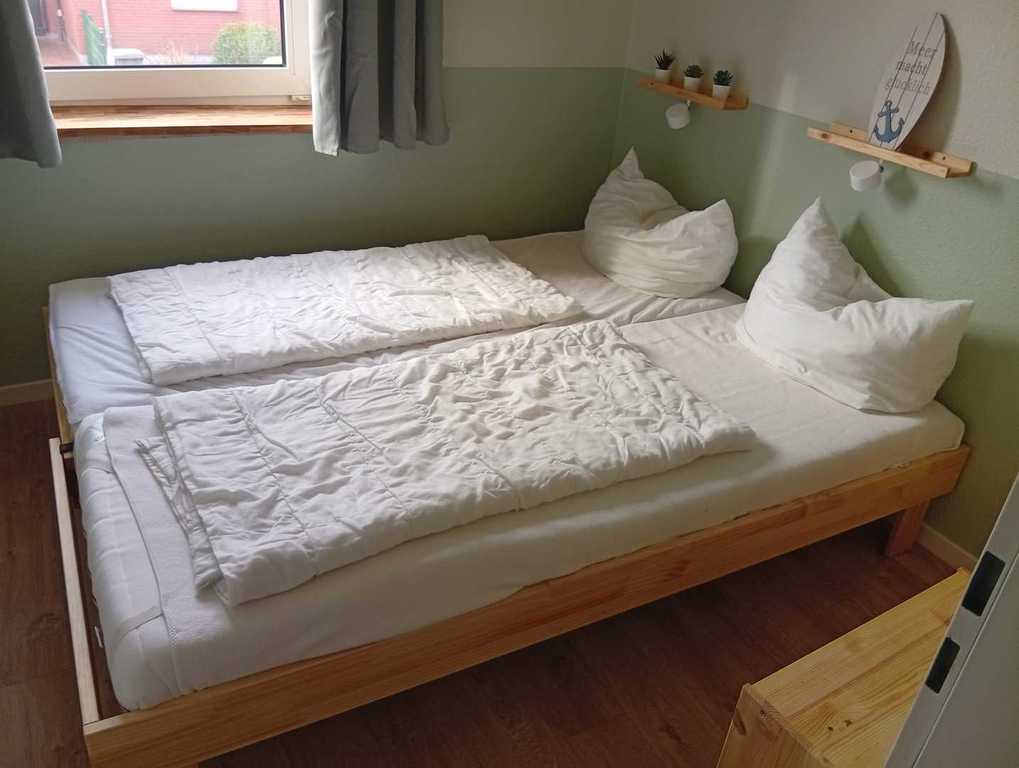 Das 2. Schlafzimmer ist ausgestattet mit einem Einzelbett. Hier haben Sie aber die Möglichkeit das zweites Bett auszuziehen. Einfach am Rahmen des Bettes ziehen und die Matratze rüberlegen. So haben Sie im handumgreh ein gemütliches Doppelbett. Unter dem Einzelbett befinden sich zwei Schubladen, in dem Sie das zweite Bettzeug finden.