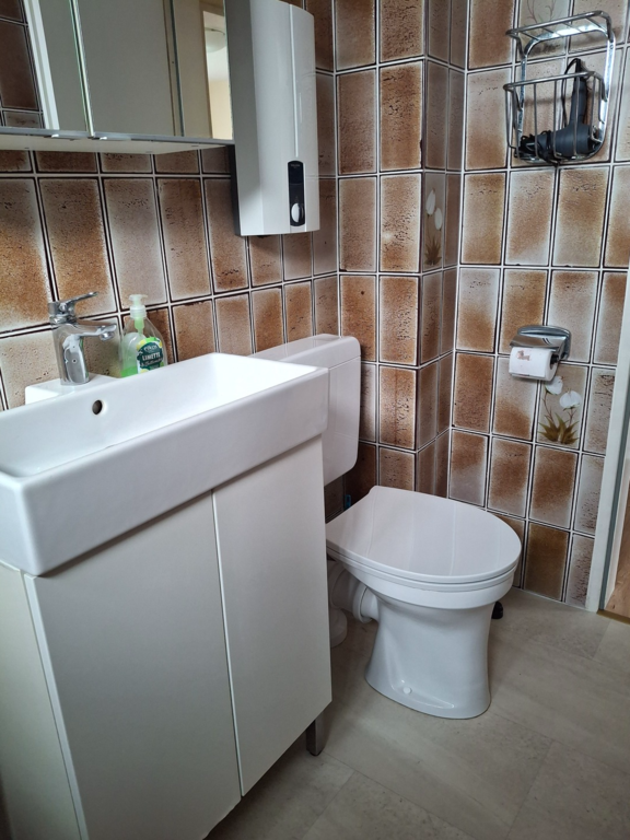 Das Badezimmer hat Tageslicht, durch das hochliegende Fenster, ausgestattet mit Dusche, WC, Waschbecken.